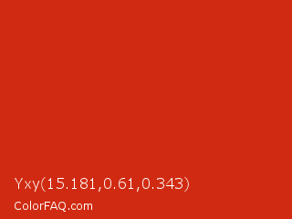 Yxy 15.181,0.61,0.343 Color is a normal red color and the nearest color is Thunderbird #c02b18. Hex code #d02b12 and RGB value is rgb(208,43,18). In RGB color space, this color is composed of 82% red, 17% green, 7% blue, In CMYK color space, this color is composed of 0% cyan, 79% magenta, 91% yellow , 18% black , In HSL color space, this color has a hue angle of 8° , 84% saturation and 44% lightness.