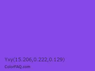 Yxy 15.206,0.222,0.129 Color is a normal violet color and the nearest color is Navy Purple #9457eb. Hex code #8547e6 and RGB value is rgb(133,71,230). In RGB color space, this color is composed of 52% red, 28% green, 90% blue, In CMYK color space, this color is composed of 42% cyan, 69% magenta, 0% yellow , 10% black , In HSL color space, this color has a hue angle of 263° , 76% saturation and 59% lightness.
