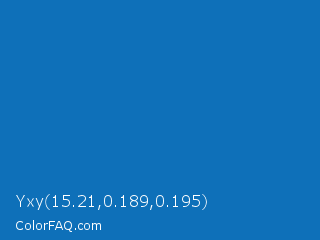 Yxy 15.21,0.189,0.195 Color is a normal blue color and the nearest color is Green Blue #1164b4. Hex code #0e70b9 and RGB value is rgb(14,112,185). In RGB color space, this color is composed of 5% red, 44% green, 73% blue, In CMYK color space, this color is composed of 92% cyan, 39% magenta, 0% yellow , 27% black , In HSL color space, this color has a hue angle of 206° , 86% saturation and 39% lightness.