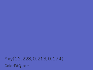 Yxy 15.228,0.213,0.174 Color is a normal blue color and the nearest color is Indigo #4f69c6. Hex code #5a64c3 and RGB value is rgb(90,100,195). In RGB color space, this color is composed of 35% red, 39% green, 76% blue, In CMYK color space, this color is composed of 54% cyan, 49% magenta, 0% yellow , 24% black , In HSL color space, this color has a hue angle of 234° , 47% saturation and 56% lightness.