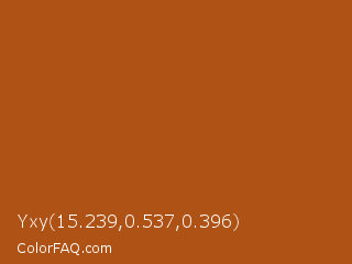 Yxy 15.239,0.537,0.396 Color is a normal orange color and the nearest color is Fiery Orange #b35213. Hex code #ae5315 and RGB value is rgb(174,83,21). In RGB color space, this color is composed of 68% red, 33% green, 8% blue, In CMYK color space, this color is composed of 0% cyan, 52% magenta, 88% yellow , 32% black , In HSL color space, this color has a hue angle of 24° , 78% saturation and 38% lightness.
