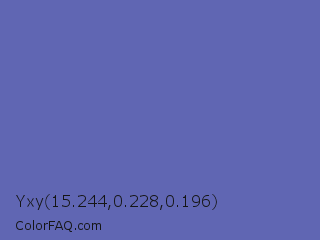 Yxy 15.244,0.228,0.196 Color is a normal blue color and the nearest color is Scampi #675fa6. Hex code #6066b3 and RGB value is rgb(96,102,179). In RGB color space, this color is composed of 38% red, 40% green, 70% blue, In CMYK color space, this color is composed of 46% cyan, 43% magenta, 0% yellow , 30% black , In HSL color space, this color has a hue angle of 236° , 35% saturation and 54% lightness.