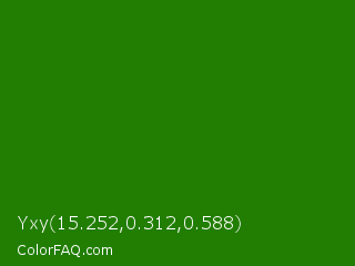 Yxy 15.252,0.312,0.588 Color is a dark green color and the nearest color is Napier Green #2a8000. Hex code #217e03 and RGB value is rgb(33,126,3). In RGB color space, this color is composed of 13% red, 49% green, 1% blue, In CMYK color space, this color is composed of 74% cyan, 0% magenta, 98% yellow , 51% black , In HSL color space, this color has a hue angle of 105° , 95% saturation and 25% lightness.