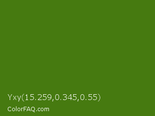 Yxy 15.259,0.345,0.55 Color is a dark green color and the nearest color is Green Leaf #436a0d. Hex code #467a10 and RGB value is rgb(70,122,16). In RGB color space, this color is composed of 27% red, 48% green, 6% blue, In CMYK color space, this color is composed of 43% cyan, 0% magenta, 87% yellow , 52% black , In HSL color space, this color has a hue angle of 89° , 77% saturation and 27% lightness.
