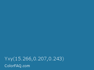 Yxy 15.266,0.207,0.243 Color is a normal blue color and the nearest color is Jelly Bean #297b9a. Hex code #20749e and RGB value is rgb(32,116,158). In RGB color space, this color is composed of 13% red, 45% green, 62% blue, In CMYK color space, this color is composed of 80% cyan, 27% magenta, 0% yellow , 38% black , In HSL color space, this color has a hue angle of 200° , 66% saturation and 37% lightness.