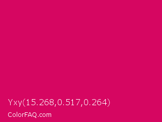 Yxy 15.268,0.517,0.264 Color is a normal rose color and the nearest color is Rubine Red #d10056. Hex code #d60661 and RGB value is rgb(214,6,97). In RGB color space, this color is composed of 84% red, 2% green, 38% blue, In CMYK color space, this color is composed of 0% cyan, 97% magenta, 55% yellow , 16% black , In HSL color space, this color has a hue angle of 334° , 95% saturation and 43% lightness.
