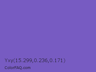 Yxy 15.299,0.236,0.171 Color is a normal indigo color and the nearest color is Fuchsia Blue #7a58c1. Hex code #775bc2 and RGB value is rgb(119,91,194). In RGB color space, this color is composed of 47% red, 36% green, 76% blue, In CMYK color space, this color is composed of 39% cyan, 53% magenta, 0% yellow , 24% black , In HSL color space, this color has a hue angle of 256° , 46% saturation and 56% lightness.