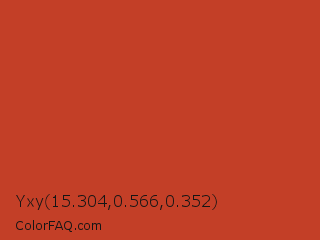 Yxy 15.304,0.566,0.352 Color is a normal red color and the nearest color is Dark Pastel Red #c23b22. Hex code #c33f27 and RGB value is rgb(195,63,39). In RGB color space, this color is composed of 76% red, 25% green, 15% blue, In CMYK color space, this color is composed of 0% cyan, 68% magenta, 80% yellow , 24% black , In HSL color space, this color has a hue angle of 9° , 67% saturation and 46% lightness.