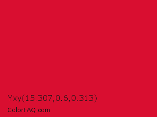 Yxy 15.307,0.6,0.313 Color is a normal red color and the nearest color is Medium Candy Apple Red #e2062c. Hex code #d90e30 and RGB value is rgb(217,14,48). In RGB color space, this color is composed of 85% red, 5% green, 19% blue, In CMYK color space, this color is composed of 0% cyan, 94% magenta, 78% yellow , 15% black , In HSL color space, this color has a hue angle of 350° , 88% saturation and 45% lightness.