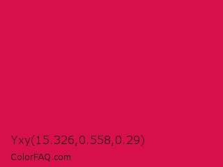 Yxy 15.326,0.558,0.29 Color is a normal rose color and the nearest color is Debian Red #d70a53. Hex code #d7104b and RGB value is rgb(215,16,75). In RGB color space, this color is composed of 84% red, 6% green, 29% blue, In CMYK color space, this color is composed of 0% cyan, 93% magenta, 65% yellow , 16% black , In HSL color space, this color has a hue angle of 342° , 86% saturation and 45% lightness.