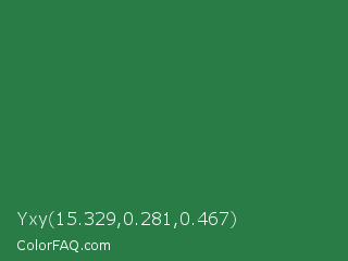 Yxy 15.329,0.281,0.467 Color is a normal green color and the nearest color is Dark Spring Green #177245. Hex code #297c46 and RGB value is rgb(41,124,70). In RGB color space, this color is composed of 16% red, 49% green, 27% blue, In CMYK color space, this color is composed of 67% cyan, 0% magenta, 44% yellow , 51% black , In HSL color space, this color has a hue angle of 141° , 50% saturation and 32% lightness.