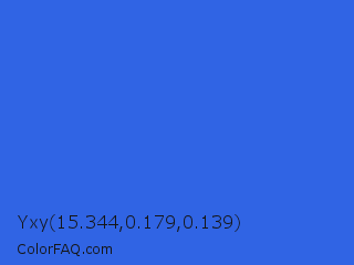 Yxy 15.344,0.179,0.139 Color is a normal blue color and the nearest color is Royal Blue #4169e1. Hex code #3064e4 and RGB value is rgb(48,100,228). In RGB color space, this color is composed of 19% red, 39% green, 89% blue, In CMYK color space, this color is composed of 79% cyan, 56% magenta, 0% yellow , 11% black , In HSL color space, this color has a hue angle of 223° , 77% saturation and 54% lightness.