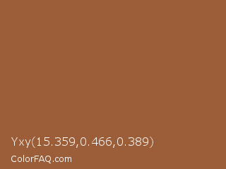 Yxy 15.359,0.466,0.389 Color is a normal orange color and the nearest color is Sepia Skin #9e5b40. Hex code #9c5e38 and RGB value is rgb(156,94,56). In RGB color space, this color is composed of 61% red, 37% green, 22% blue, In CMYK color space, this color is composed of 0% cyan, 40% magenta, 64% yellow , 39% black , In HSL color space, this color has a hue angle of 23° , 47% saturation and 42% lightness.
