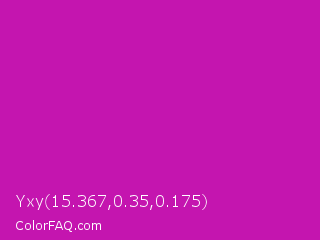 Yxy 15.367,0.35,0.175 Color is a normal magenta color and the nearest color is Byzantine #bd33a4. Hex code #c415af and RGB value is rgb(196,21,175). In RGB color space, this color is composed of 77% red, 8% green, 69% blue, In CMYK color space, this color is composed of 0% cyan, 89% magenta, 11% yellow , 23% black , In HSL color space, this color has a hue angle of 307° , 81% saturation and 43% lightness.