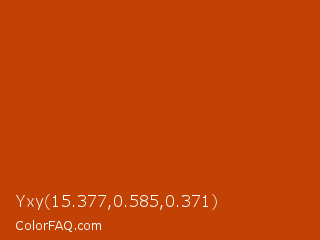 Yxy 15.377,0.585,0.371 Color is a normal orange color and the nearest color is Mahogany #c04000. Hex code #c24205 and RGB value is rgb(194,66,5). In RGB color space, this color is composed of 76% red, 26% green, 2% blue, In CMYK color space, this color is composed of 0% cyan, 66% magenta, 97% yellow , 24% black , In HSL color space, this color has a hue angle of 19° , 95% saturation and 39% lightness.