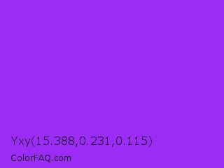 Yxy 15.388,0.231,0.115 Color is a normal purple color and the nearest color is Veronica #a020f0. Hex code #9b2cf5 and RGB value is rgb(155,44,245). In RGB color space, this color is composed of 61% red, 17% green, 96% blue, In CMYK color space, this color is composed of 37% cyan, 82% magenta, 0% yellow , 4% black , In HSL color space, this color has a hue angle of 273° , 91% saturation and 57% lightness.