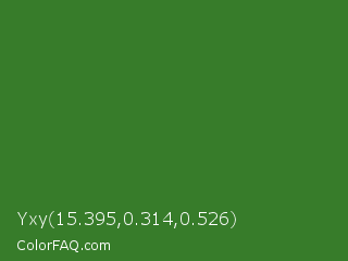 Yxy 15.395,0.314,0.526 Color is a normal green color and the nearest color is Bilbao #327c14. Hex code #377c2a and RGB value is rgb(55,124,42). In RGB color space, this color is composed of 22% red, 49% green, 16% blue, In CMYK color space, this color is composed of 56% cyan, 0% magenta, 66% yellow , 51% black , In HSL color space, this color has a hue angle of 110° , 49% saturation and 33% lightness.