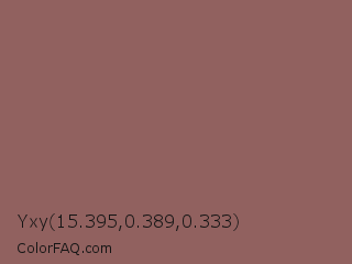 Yxy 15.395,0.389,0.333 Color is a normal red color and the nearest color is Rose Taupe #905d5d. Hex code #91615f and RGB value is rgb(145,97,95). In RGB color space, this color is composed of 57% red, 38% green, 37% blue, In CMYK color space, this color is composed of 0% cyan, 33% magenta, 34% yellow , 43% black , In HSL color space, this color has a hue angle of 2° , 21% saturation and 47% lightness.
