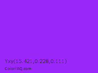 Yxy 15.421,0.228,0.111 Color is a normal purple color and the nearest color is Veronica #a020f0. Hex code #9c27fa and RGB value is rgb(156,39,250). In RGB color space, this color is composed of 61% red, 15% green, 98% blue, In CMYK color space, this color is composed of 38% cyan, 84% magenta, 0% yellow , 2% black , In HSL color space, this color has a hue angle of 273° , 95% saturation and 57% lightness.