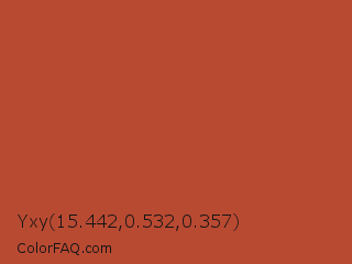 Yxy 15.442,0.532,0.357 Color is a normal red color and the nearest color is Mojo #c04737. Hex code #b94a32 and RGB value is rgb(185,74,50). In RGB color space, this color is composed of 73% red, 29% green, 20% blue, In CMYK color space, this color is composed of 0% cyan, 60% magenta, 73% yellow , 27% black , In HSL color space, this color has a hue angle of 11° , 57% saturation and 46% lightness.