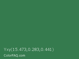 Yxy 15.473,0.283,0.441 Color is a normal green color and the nearest color is Goblin #3d7d52. Hex code #357b4e and RGB value is rgb(53,123,78). In RGB color space, this color is composed of 21% red, 48% green, 31% blue, In CMYK color space, this color is composed of 57% cyan, 0% magenta, 37% yellow , 52% black , In HSL color space, this color has a hue angle of 141° , 40% saturation and 35% lightness.