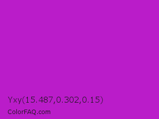 Yxy 15.487,0.302,0.15 Color is a normal magenta color and the nearest color is Steel Pink #cc33cc. Hex code #ba1cc9 and RGB value is rgb(186,28,201). In RGB color space, this color is composed of 73% red, 11% green, 79% blue, In CMYK color space, this color is composed of 7% cyan, 86% magenta, 0% yellow , 21% black , In HSL color space, this color has a hue angle of 295° , 76% saturation and 45% lightness.