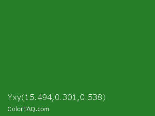 Yxy 15.494,0.301,0.538 Color is a normal green color and the nearest color is Forest Green #228b22. Hex code #267e29 and RGB value is rgb(38,126,41). In RGB color space, this color is composed of 15% red, 49% green, 16% blue, In CMYK color space, this color is composed of 70% cyan, 0% magenta, 67% yellow , 51% black , In HSL color space, this color has a hue angle of 122° , 54% saturation and 32% lightness.