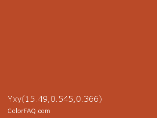 Yxy 15.49,0.545,0.366 Color is a normal red color and the nearest color is Mojo #c04737. Hex code #ba4a28 and RGB value is rgb(186,74,40). In RGB color space, this color is composed of 73% red, 29% green, 16% blue, In CMYK color space, this color is composed of 0% cyan, 60% magenta, 78% yellow , 27% black , In HSL color space, this color has a hue angle of 14° , 65% saturation and 44% lightness.