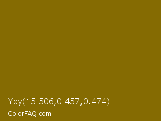 Yxy 15.506,0.457,0.474 Color is a dark yellow color and the nearest color is Corn Harvest #8b6b0b. Hex code #856b02 and RGB value is rgb(133,107,2). In RGB color space, this color is composed of 52% red, 42% green, 1% blue, In CMYK color space, this color is composed of 0% cyan, 20% magenta, 98% yellow , 48% black , In HSL color space, this color has a hue angle of 48° , 97% saturation and 26% lightness.
