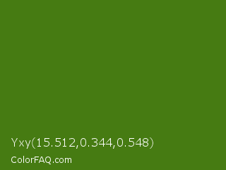 Yxy 15.512,0.344,0.548 Color is a dark green color and the nearest color is Green Leaf #436a0d. Hex code #467b12 and RGB value is rgb(70,123,18). In RGB color space, this color is composed of 27% red, 48% green, 7% blue, In CMYK color space, this color is composed of 43% cyan, 0% magenta, 85% yellow , 52% black , In HSL color space, this color has a hue angle of 90° , 74% saturation and 28% lightness.