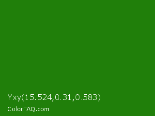 Yxy 15.524,0.31,0.583 Color is a dark green color and the nearest color is Napier Green #2a8000. Hex code #207f0a and RGB value is rgb(32,127,10). In RGB color space, this color is composed of 13% red, 50% green, 4% blue, In CMYK color space, this color is composed of 75% cyan, 0% magenta, 92% yellow , 50% black , In HSL color space, this color has a hue angle of 109° , 85% saturation and 27% lightness.