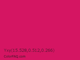 Yxy 15.528,0.512,0.266 Color is a normal rose color and the nearest color is Dogwood Rose #d71868. Hex code #d51462 and RGB value is rgb(213,20,98). In RGB color space, this color is composed of 84% red, 8% green, 38% blue, In CMYK color space, this color is composed of 0% cyan, 91% magenta, 54% yellow , 16% black , In HSL color space, this color has a hue angle of 336° , 83% saturation and 46% lightness.