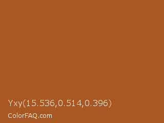 Yxy 15.536,0.514,0.396 Color is a normal orange color and the nearest color is Paarl #a65529. Hex code #a95823 and RGB value is rgb(169,88,35). In RGB color space, this color is composed of 66% red, 35% green, 14% blue, In CMYK color space, this color is composed of 0% cyan, 48% magenta, 79% yellow , 34% black , In HSL color space, this color has a hue angle of 24° , 66% saturation and 40% lightness.
