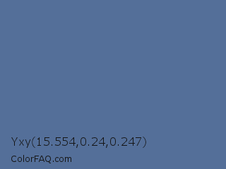 Yxy 15.554,0.24,0.247 Color is a normal blue color and the nearest color is Kashmir Blue #507096. Hex code #546f99 and RGB value is rgb(84,111,153). In RGB color space, this color is composed of 33% red, 44% green, 60% blue, In CMYK color space, this color is composed of 45% cyan, 27% magenta, 0% yellow , 40% black , In HSL color space, this color has a hue angle of 217° , 29% saturation and 46% lightness.