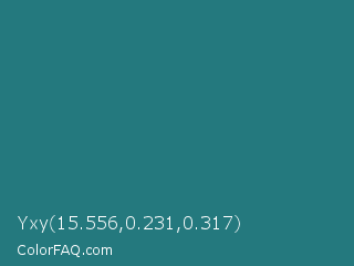 Yxy 15.556,0.231,0.317 Color is a normal cyan color and the nearest color is Elm #1c7c7d. Hex code #24797e and RGB value is rgb(36,121,126). In RGB color space, this color is composed of 14% red, 47% green, 49% blue, In CMYK color space, this color is composed of 71% cyan, 4% magenta, 0% yellow , 51% black , In HSL color space, this color has a hue angle of 183° , 56% saturation and 32% lightness.