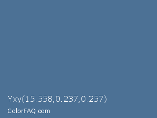 Yxy 15.558,0.237,0.257 Color is a normal blue color and the nearest color is Kashmir Blue #507096. Hex code #4c7195 and RGB value is rgb(76,113,149). In RGB color space, this color is composed of 30% red, 44% green, 58% blue, In CMYK color space, this color is composed of 49% cyan, 24% magenta, 0% yellow , 42% black , In HSL color space, this color has a hue angle of 210° , 32% saturation and 44% lightness.