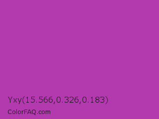 Yxy 15.566,0.326,0.183 Color is a normal magenta color and the nearest color is Byzantine #bd33a4. Hex code #b339ae and RGB value is rgb(179,57,174). In RGB color space, this color is composed of 70% red, 22% green, 68% blue, In CMYK color space, this color is composed of 0% cyan, 68% magenta, 3% yellow , 30% black , In HSL color space, this color has a hue angle of 302° , 52% saturation and 46% lightness.