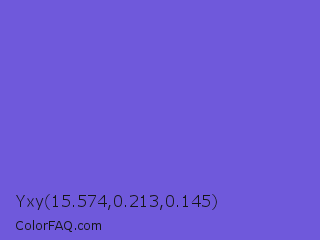 Yxy 15.574,0.213,0.145 Color is a normal indigo color and the nearest color is Slate Blue #6a5acd. Hex code #6f59db and RGB value is rgb(111,89,219). In RGB color space, this color is composed of 44% red, 35% green, 86% blue, In CMYK color space, this color is composed of 49% cyan, 59% magenta, 0% yellow , 14% black , In HSL color space, this color has a hue angle of 250° , 64% saturation and 60% lightness.