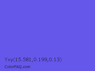 Yxy 15.581,0.199,0.13 Color is a light indigo color and the nearest color is Majorelle Blue #6050dc. Hex code #6657eb and RGB value is rgb(102,87,235). In RGB color space, this color is composed of 40% red, 34% green, 92% blue, In CMYK color space, this color is composed of 57% cyan, 63% magenta, 0% yellow , 8% black , In HSL color space, this color has a hue angle of 246° , 79% saturation and 63% lightness.