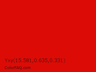 Yxy 15.581,0.635,0.331 Color is a normal red color and the nearest color is Rosso Corsa #d40000. Hex code #dd0b06 and RGB value is rgb(221,11,6). In RGB color space, this color is composed of 87% red, 4% green, 2% blue, In CMYK color space, this color is composed of 0% cyan, 95% magenta, 97% yellow , 13% black , In HSL color space, this color has a hue angle of 1° , 95% saturation and 45% lightness.