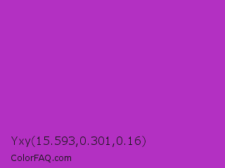 Yxy 15.593,0.301,0.16 Color is a normal magenta color and the nearest color is Steel Pink #cc33cc. Hex code #b330c2 and RGB value is rgb(179,48,194). In RGB color space, this color is composed of 70% red, 19% green, 76% blue, In CMYK color space, this color is composed of 8% cyan, 75% magenta, 0% yellow , 24% black , In HSL color space, this color has a hue angle of 294° , 60% saturation and 47% lightness.