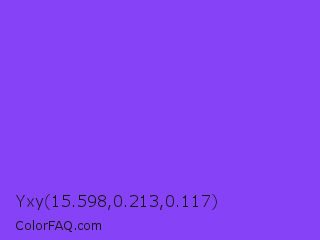 Yxy 15.598,0.213,0.117 Color is a light violet color and the nearest color is Navy Purple #9457eb. Hex code #8542f7 and RGB value is rgb(133,66,247). In RGB color space, this color is composed of 52% red, 26% green, 97% blue, In CMYK color space, this color is composed of 46% cyan, 73% magenta, 0% yellow , 3% black , In HSL color space, this color has a hue angle of 262° , 92% saturation and 61% lightness.