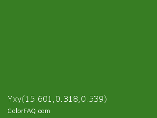 Yxy 15.601,0.318,0.539 Color is a normal green color and the nearest color is Bilbao #327c14. Hex code #377d23 and RGB value is rgb(55,125,35). In RGB color space, this color is composed of 22% red, 49% green, 14% blue, In CMYK color space, this color is composed of 56% cyan, 0% magenta, 72% yellow , 51% black , In HSL color space, this color has a hue angle of 107° , 56% saturation and 31% lightness.
