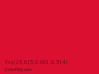 Yxy 15.615,0.601,0.314 Color is a normal red color and the nearest color is Crimson #dc143c. Hex code #db1030 and RGB value is rgb(219,16,48). In RGB color space, this color is composed of 86% red, 6% green, 19% blue, In CMYK color space, this color is composed of 0% cyan, 93% magenta, 78% yellow , 14% black , In HSL color space, this color has a hue angle of 351° , 86% saturation and 46% lightness.
