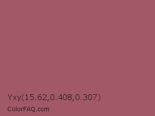 Yxy 15.62,0.408,0.307 Color is a normal red color and the nearest color is Deep Puce #a95c68. Hex code #a25866 and RGB value is rgb(162,88,102). In RGB color space, this color is composed of 64% red, 35% green, 40% blue, In CMYK color space, this color is composed of 0% cyan, 46% magenta, 37% yellow , 36% black , In HSL color space, this color has a hue angle of 349° , 30% saturation and 49% lightness.