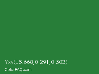 Yxy 15.668,0.291,0.503 Color is a normal green color and the nearest color is Dark Spring Green #177245. Hex code #287e39 and RGB value is rgb(40,126,57). In RGB color space, this color is composed of 16% red, 49% green, 22% blue, In CMYK color space, this color is composed of 68% cyan, 0% magenta, 55% yellow , 51% black , In HSL color space, this color has a hue angle of 132° , 52% saturation and 33% lightness.