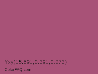Yxy 15.691,0.391,0.273 Color is a normal rose color and the nearest color is China Rose #a8516e. Hex code #a85277 and RGB value is rgb(168,82,119). In RGB color space, this color is composed of 66% red, 32% green, 47% blue, In CMYK color space, this color is composed of 0% cyan, 51% magenta, 29% yellow , 34% black , In HSL color space, this color has a hue angle of 334° , 34% saturation and 49% lightness.