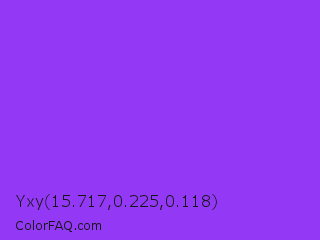 Yxy 15.717,0.225,0.118 Color is a normal violet color and the nearest color is Blue Violet #8a2be2. Hex code #9339f5 and RGB value is rgb(147,57,245). In RGB color space, this color is composed of 58% red, 22% green, 96% blue, In CMYK color space, this color is composed of 40% cyan, 77% magenta, 0% yellow , 4% black , In HSL color space, this color has a hue angle of 269° , 90% saturation and 59% lightness.