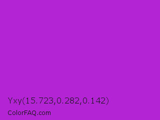 Yxy 15.723,0.282,0.142 Color is a normal purple color and the nearest color is Vivid Mulberry #b80ce3. Hex code #b325d4 and RGB value is rgb(179,37,212). In RGB color space, this color is composed of 70% red, 15% green, 83% blue, In CMYK color space, this color is composed of 16% cyan, 83% magenta, 0% yellow , 17% black , In HSL color space, this color has a hue angle of 289° , 70% saturation and 49% lightness.