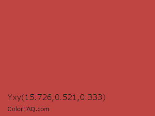 Yxy 15.726,0.521,0.333 Color is a normal red color and the nearest color is Mojo #c04737. Hex code #bf4542 and RGB value is rgb(191,69,66). In RGB color space, this color is composed of 75% red, 27% green, 26% blue, In CMYK color space, this color is composed of 0% cyan, 64% magenta, 65% yellow , 25% black , In HSL color space, this color has a hue angle of 1° , 49% saturation and 50% lightness.